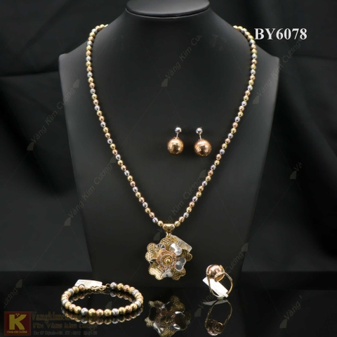 Bộ trang sức BY6078 vàng ba màu cao cấp 18k nhập khẩu italy. Được sản xuất trên công nghệ dây truyền hiện đại bậc nhất . Màu sắc tinh tế nhã nhặn , phù hợp với mọi độ tuổi . Kiểu cách trẻ trung . Đặc biệt bộ trang sức này rất tôn lên được vẻ đẹp của người phụ nữ thành đạt , quý phái .