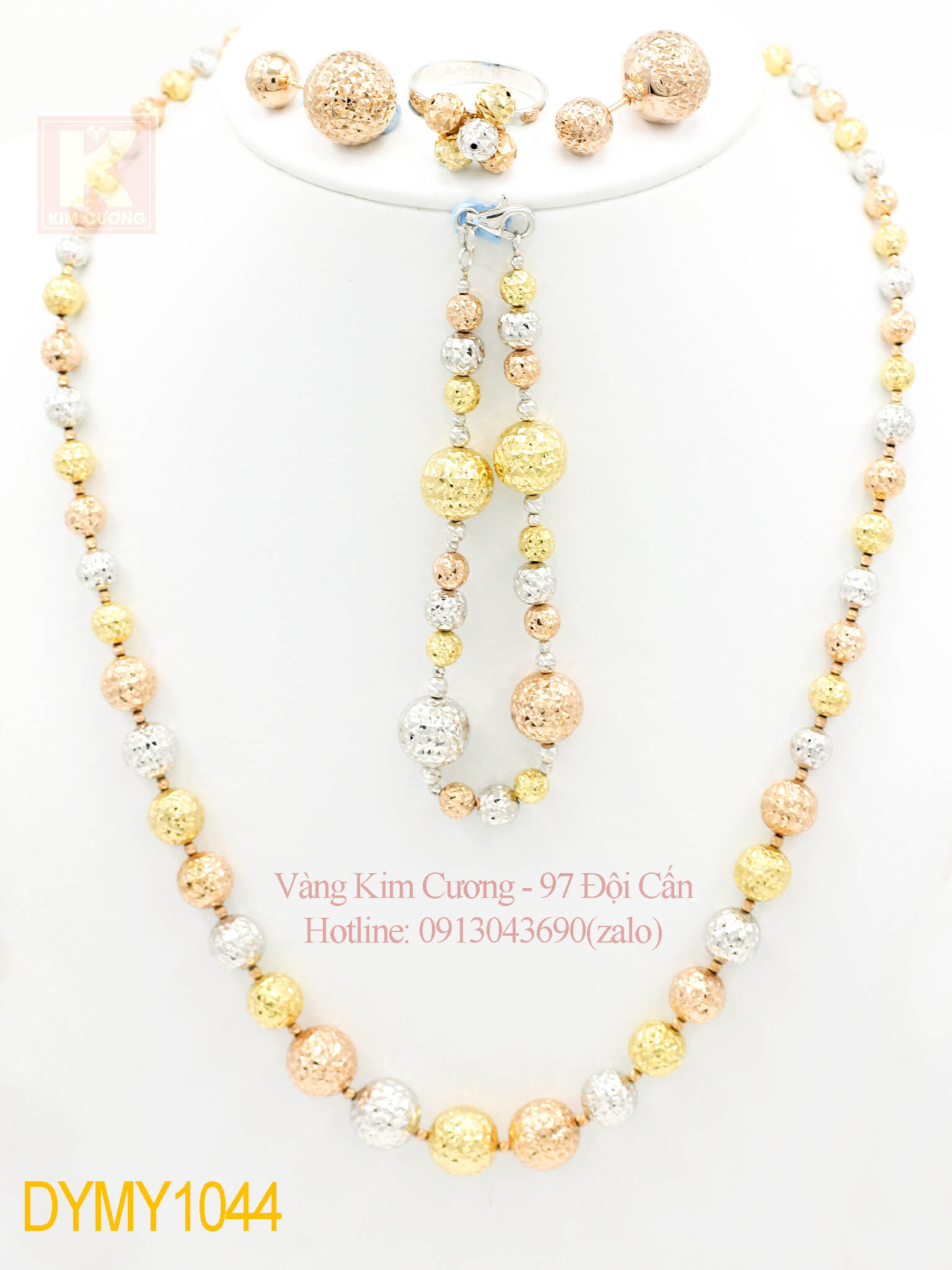 Dây chuyền nữ vàng tây mã DYMY1044 bao gồm dây 20 triệu, khuyên tai 6,5 triệu, nhẫn 5 triệu, lắc 8.5 triệu.