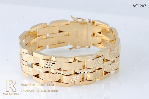 Lắc tay nam vàng cao cấp 16k công nghệ 3D mã VC1207 được sản xuất từ vàng cao cấp tiêu chuẩn quốc tế 16k ( tên thường gọi chung là vàng 18k ), đây là oại vàng trang sức cao cấp có hàng lượng vàng nguyên chất 9999 cao chiếm tới 61% kết hợp các kim loại quý khác với tỉ lệ cân đối hài hòa nhất hiện nay tạo ra loại vàng cao cấp có độ cứng, độ sáng bóng tốt nhất không bị ảnh hưởng của môi trường ngoài tác động nên sản phẩm trang sức vàng 16k thường không xi mà vẫn luôn bóng sáng ánh vàng kim đây là loại vàng hoàn hảo trong thiết kế trang sức