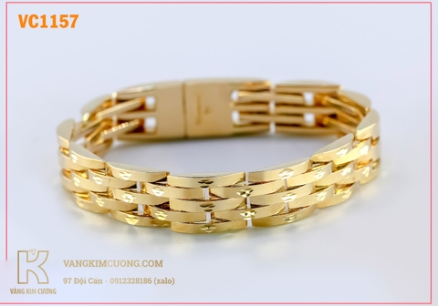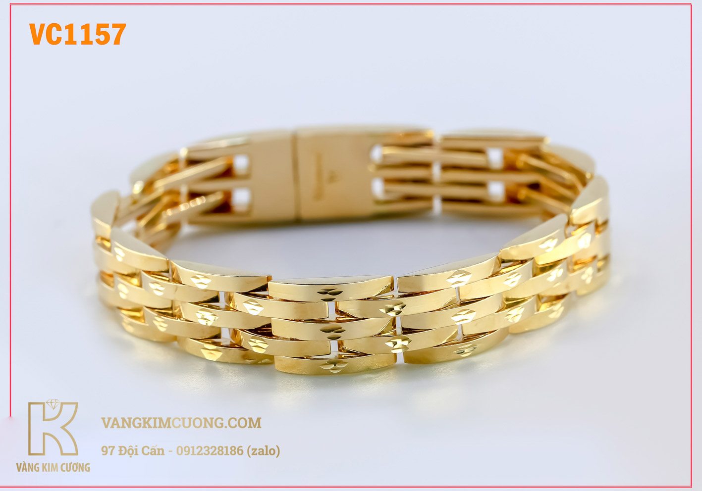 Lắc tay nam vàng cao cấp 16k công nghệ 3D mã VC1157 được sản xuất từ vàng cao cấp tiêu chuẩn quốc tế 16k ( tên thường gọi chung là vàng 18k ), đây là oại vàng trang sức cao cấp có hàng lượng vàng nguyên chất 9999 cao chiếm tới 61% kết hợp các kim loại quý khác với tỉ lệ cân đối hài hòa nhất hiện nay tạo ra loại vàng cao cấp có độ cứng, độ sáng bóng tốt nhất không bị ảnh hưởng của môi trường ngoài tác động nên sản phẩm trang sức vàng 16k thường không xi mà vẫn luôn bóng sáng ánh vàng kim đây là loại vàng hoàn hảo trong thiết kế trang sức