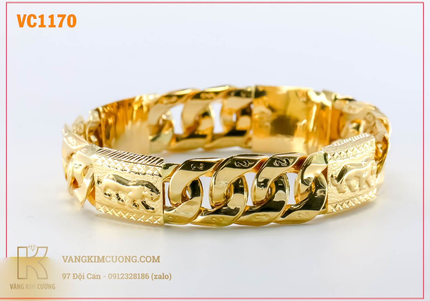 Lắc tay nam vàng cao cấp 16k công nghệ 3D mã VC1170 được sản xuất từ vàng cao cấp tiêu chuẩn quốc tế 16k ( tên thường gọi chung là vàng 18k ), đây là oại vàng trang sức cao cấp có hàng lượng vàng nguyên chất 9999 cao chiếm tới 61% kết hợp các kim loại quý khác với tỉ lệ cân đối hài hòa nhất hiện nay tạo ra loại vàng cao cấp có độ cứng, độ sáng bóng tốt nhất không bị ảnh hưởng của môi trường ngoài tác động nên sản phẩm trang sức vàng 16k thường không xi mà vẫn luôn bóng sáng ánh vàng kim đây là loại vàng hoàn hảo trong thiết kế trang sức