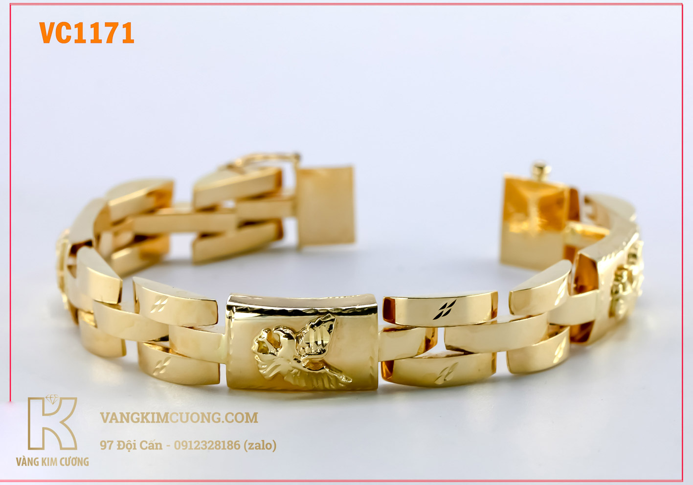 Lắc tay nam vàng cao cấp 16k công nghệ 3D mã VC1171 được sản xuất từ vàng cao cấp tiêu chuẩn quốc tế 16k ( tên thường gọi chung là vàng 18k ), đây là oại vàng trang sức cao cấp có hàng lượng vàng nguyên chất 9999 cao chiếm tới 61% kết hợp các kim loại quý khác với tỉ lệ cân đối hài hòa nhất hiện nay tạo ra loại vàng cao cấp có độ cứng, độ sáng bóng tốt nhất không bị ảnh hưởng của môi trường ngoài tác động nên sản phẩm trang sức vàng 16k thường không xi mà vẫn luôn bóng sáng ánh vàng kim đây là loại vàng hoàn hảo trong thiết kế trang sức