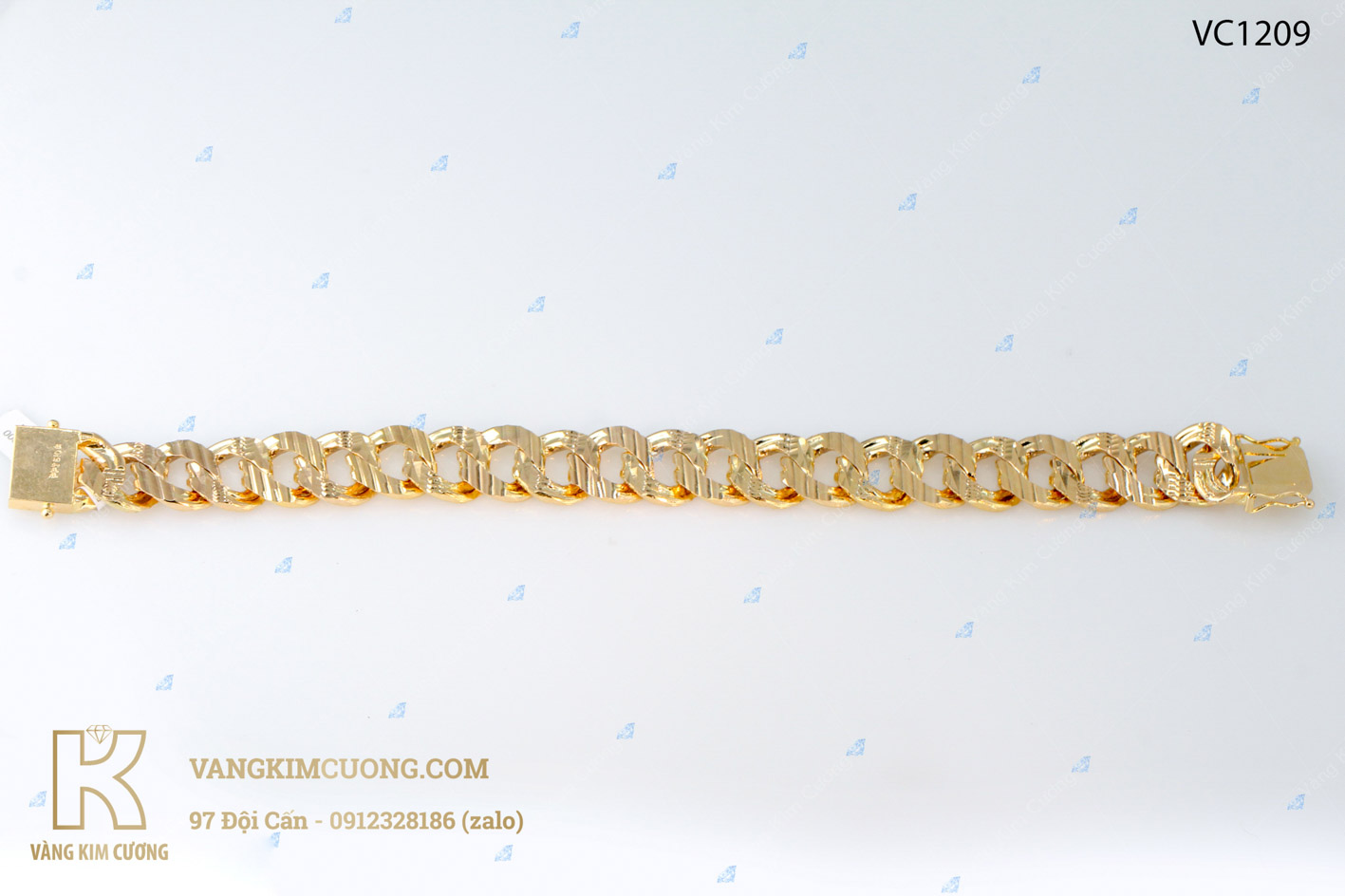 Lắc tay nam vàng cao cấp 16k công nghệ 3D mã VC1209 được sản xuất từ vàng cao cấp tiêu chuẩn quốc tế 16k ( tên thường gọi chung là vàng 18k ), đây là oại vàng trang sức cao cấp có hàng lượng vàng nguyên chất 9999 cao chiếm tới 61% kết hợp các kim loại quý khác với tỉ lệ cân đối hài hòa nhất hiện nay tạo ra loại vàng cao cấp có độ cứng, độ sáng bóng tốt nhất không bị ảnh hưởng của môi trường ngoài tác động nên sản phẩm trang sức vàng 16k thường không xi mà vẫn luôn bóng sáng ánh vàng kim đây là loại vàng hoàn hảo trong thiết kế trang sức