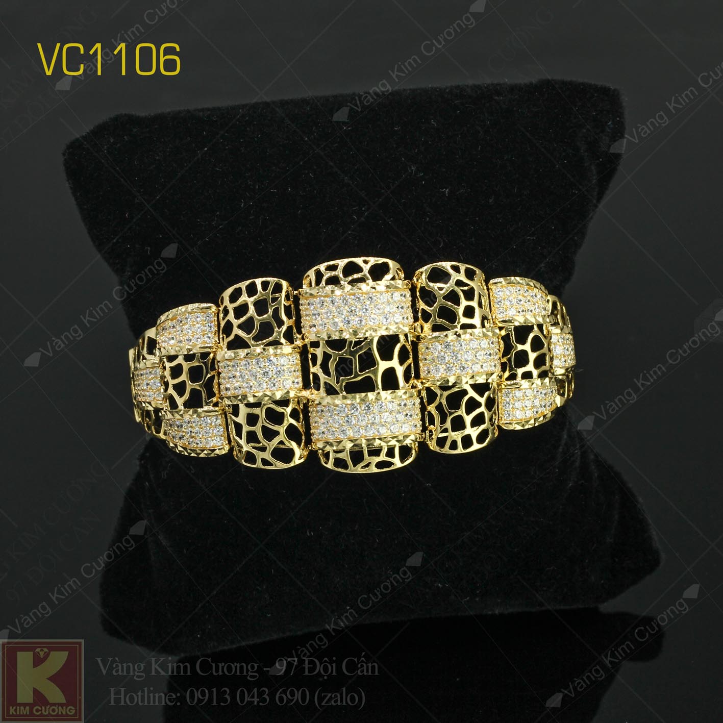 Lắc tay nữ vàng cao cấp 16k công nghệ 3D mã VC1106 được sản xuất từ vàng cao cấp tiêu chuẩn quốc tế 16k ( tên thường gọi chung là vàng 18k ), đây là oại vàng trang sức cao cấp có hàng lượng vàng nguyên chất 9999 cao chiếm tới 61% kết hợp các kim loại quý khác với tỉ lệ cân đối hài hòa nhất hiện nay tạo ra loại vàng cao cấp có độ cứng, độ sáng bóng tốt nhất không bị ảnh hưởng của môi trường ngoài tác động nên sản phẩm trang sức vàng 16k thường không xi mà vẫn luôn bóng sáng ánh vàng kim đây là loại vàng hoàn hảo trong thiết kế trang sức