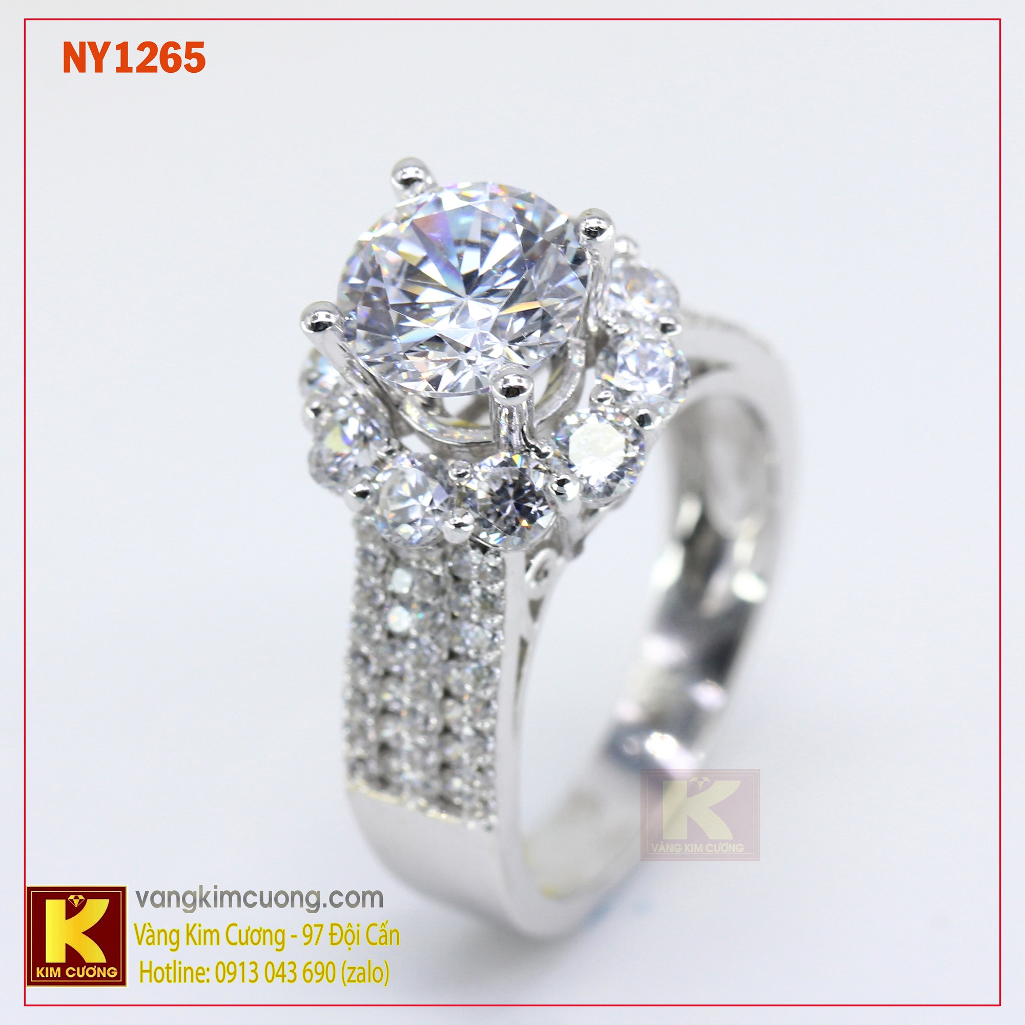 ...Nhẫn NY1265 là nhẫn vàng trắng cao cấp 18k nhập khẩu nguyên chiếc Italy, đá kim cương nhân tạo có giá 9,086 triệu.