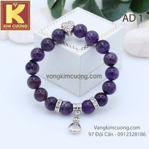 VÒNG TAY THẠCH ANH TÍM Mix phụ kiện túi tiền, chữ LOVE mạ bạc.